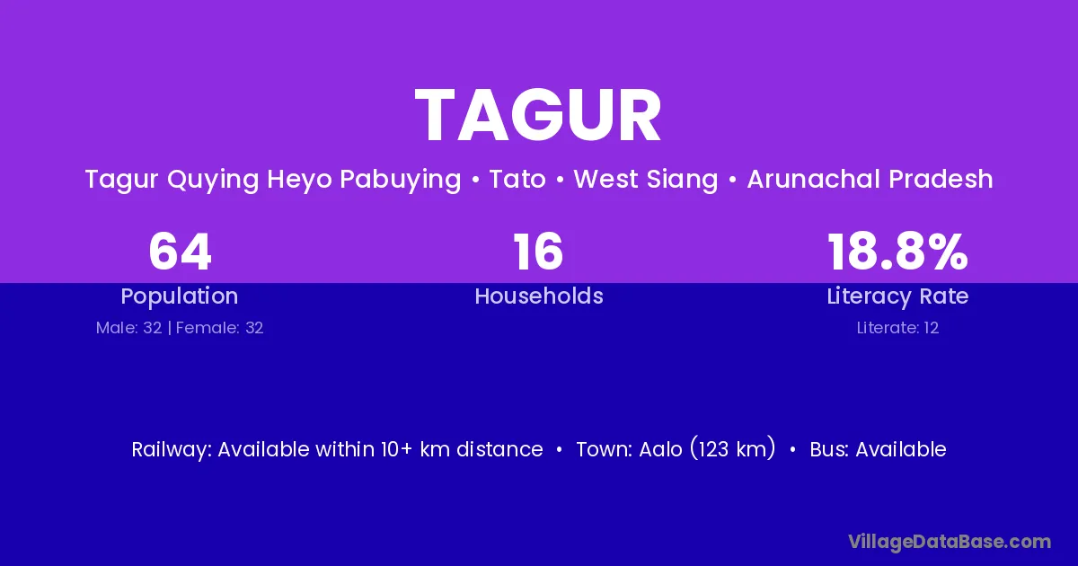 Aalo (123 km) is the nearest town to Tagur village for major economic activities and is located approximately 123 km away.