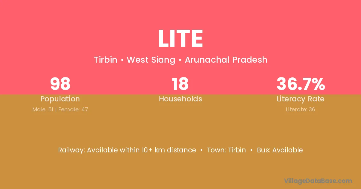 The literacy rate of Lite village is 36.73%. Male literacy stands at 43.14% and female literacy at 29.79%.