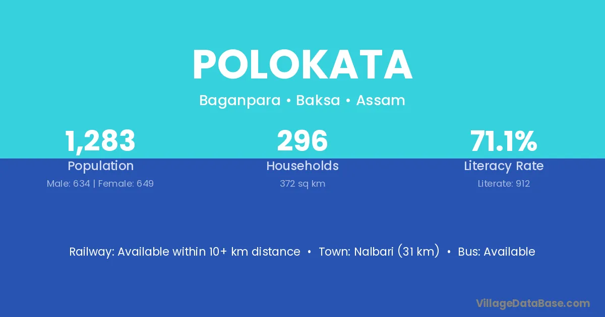 Nalbari (31 km) is the nearest town to Polokata village for major economic activities and is located approximately 31 km away.