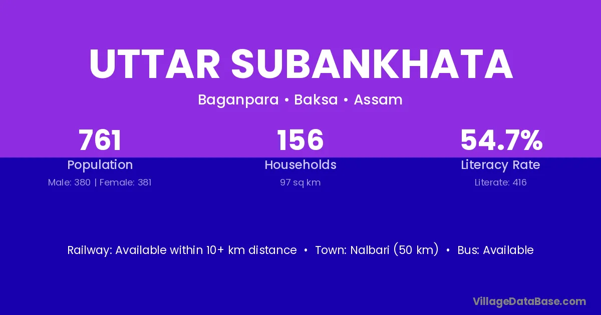 Nalbari (50 km) is the nearest town to Uttar Subankhata village for major economic activities and is located approximately 50 km away.