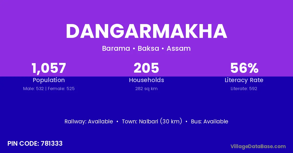 Nalbari (30 km) is the nearest town to Dangarmakha village for major economic activities and is located approximately 30 km away.
