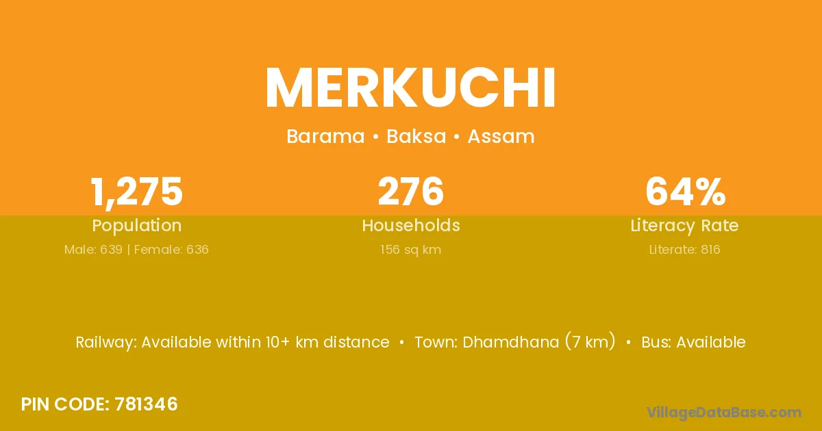 Dhamdhana (7 km) is the nearest town to Merkuchi village for major economic activities and is located approximately 7 km away.