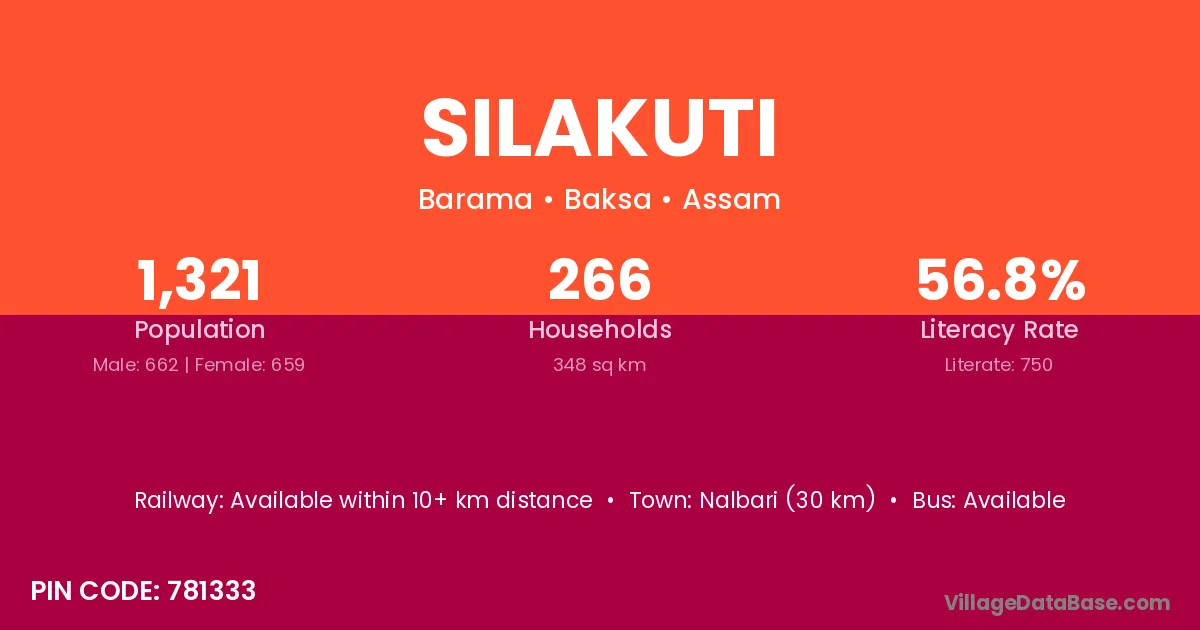 Nalbari (30 km) is the nearest town to Silakuti village for major economic activities and is located approximately 30 km away.