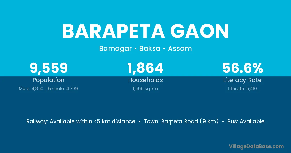 Barpeta Road (9 km) is the nearest town to Barapeta Gaon village for major economic activities and is located approximately 9 km away.
