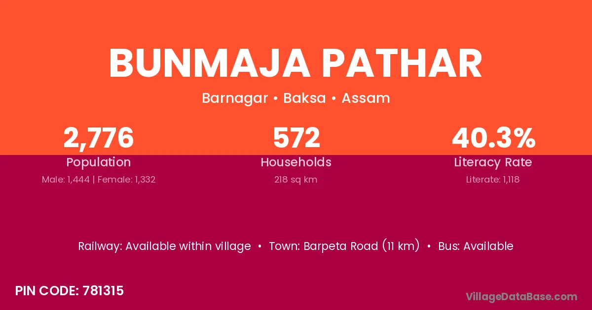 Barpeta Road (11 km) is the nearest town to Bunmaja Pathar village for major economic activities and is located approximately 11 km away.