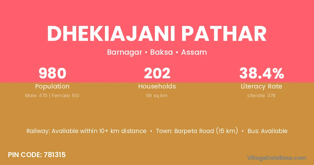 Barpeta Road (15 km) is the nearest town to Dhekiajani Pathar village for major economic activities and is located approximately 15 km away.