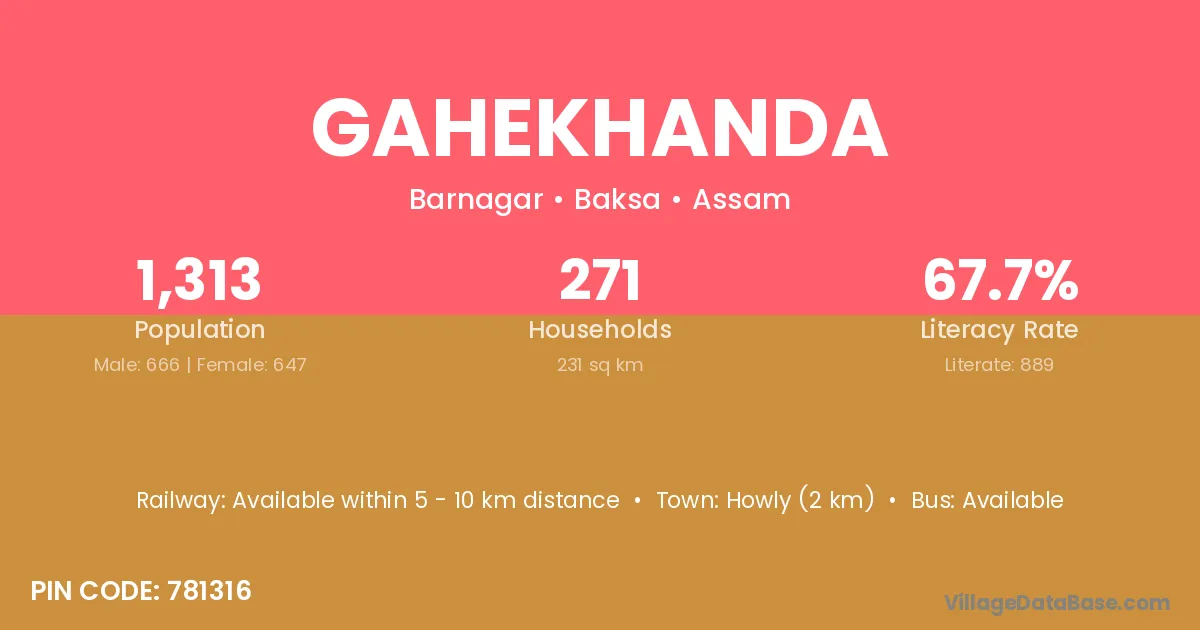 Howly (2 km) is the nearest town to Gahekhanda village for major economic activities and is located approximately 2 km away.
