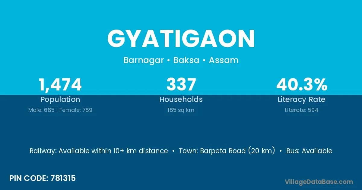 Barpeta Road (20 km) is the nearest town to Gyatigaon village for major economic activities and is located approximately 20 km away.
