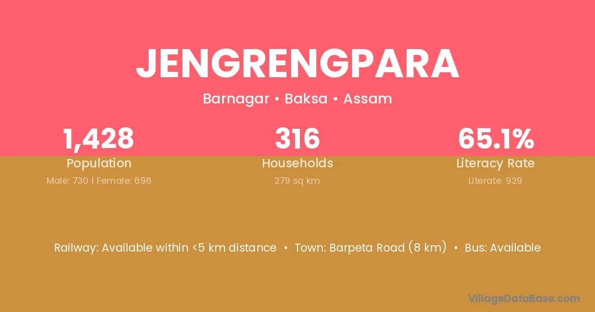 Barpeta Road (8 km) is the nearest town to Jengrengpara village for major economic activities and is located approximately 8 km away.