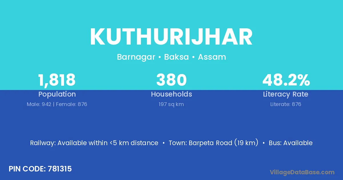 Barpeta Road (19 km) is the nearest town to Kuthurijhar village for major economic activities and is located approximately 19 km away.
