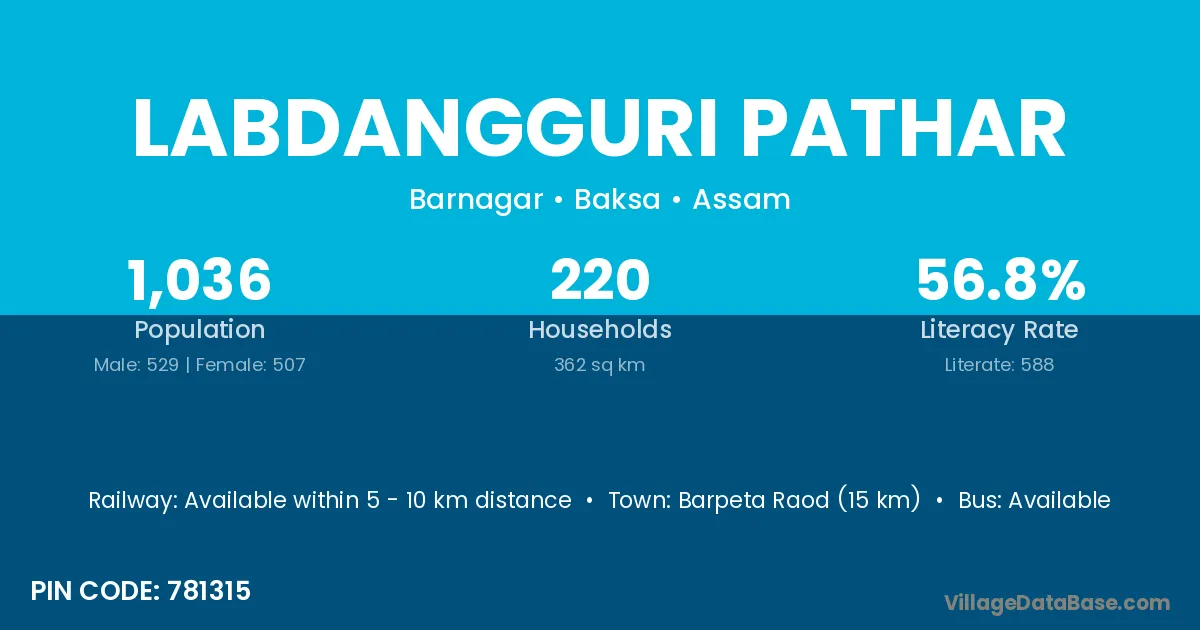 Barpeta Raod (15 km) is the nearest town to Labdangguri Pathar village for major economic activities and is located approximately 15 km away.