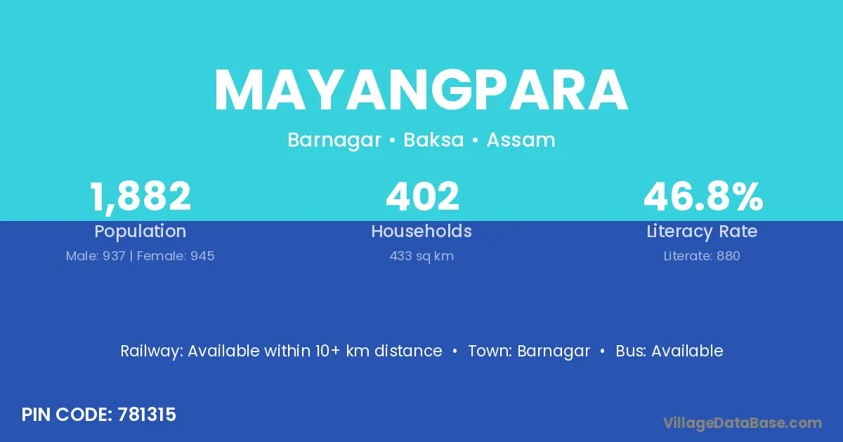 Mayangpara village has a total population of 1,882 people, of which 937 are males and 945 are females.