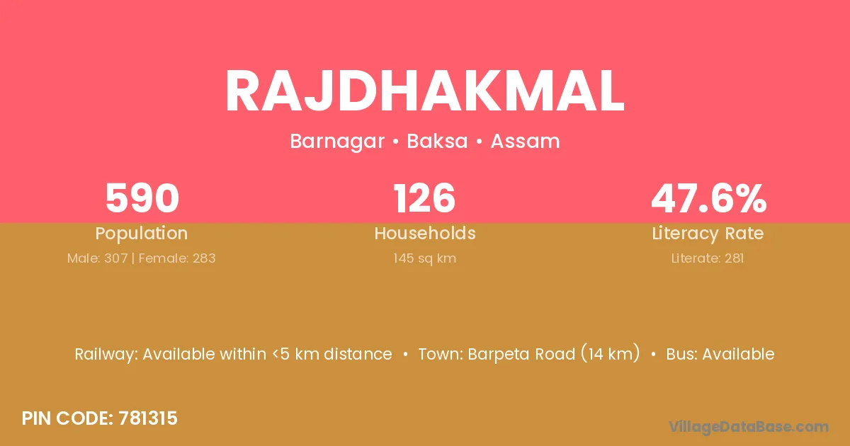 Barpeta Road (14 km) is the nearest town to Rajdhakmal village for major economic activities and is located approximately 14 km away.