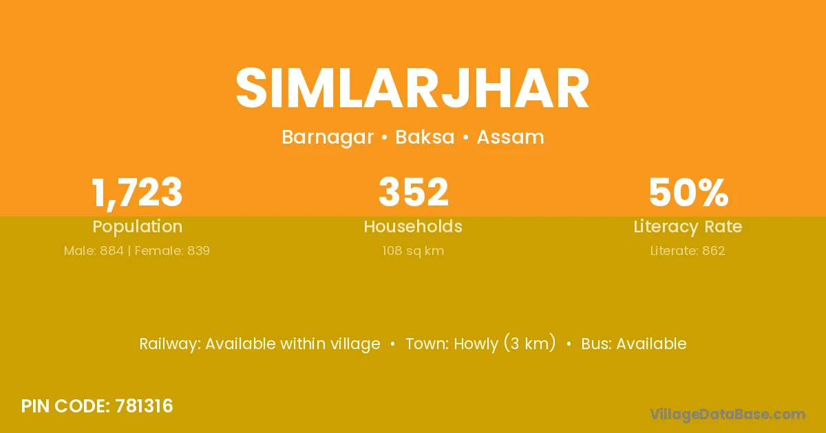 Howly (3 km) is the nearest town to Simlarjhar village for major economic activities and is located approximately 3 km away.