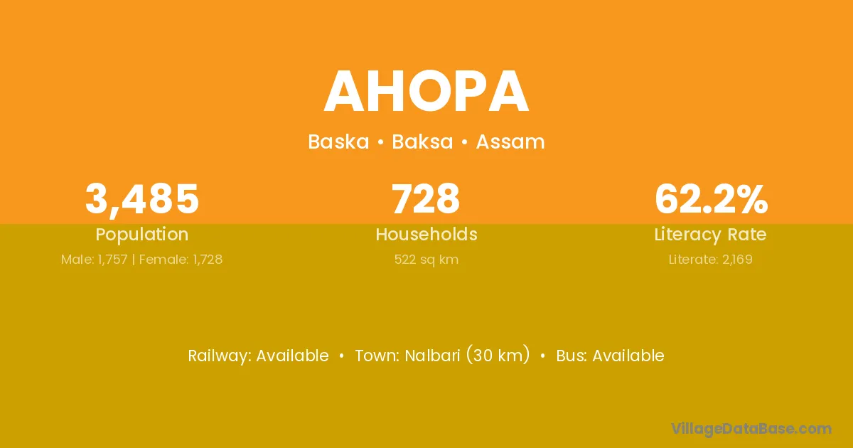 Nalbari (30 km) is the nearest town to Ahopa village for major economic activities and is located approximately 30 km away.