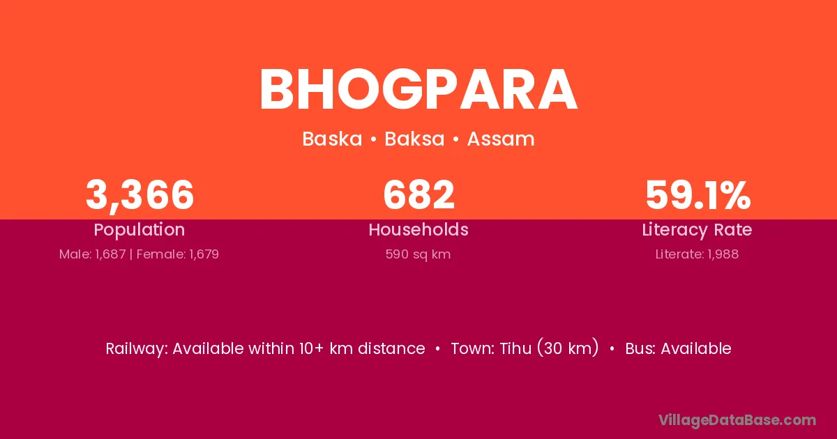 Tihu (30 km) is the nearest town to Bhogpara village for major economic activities and is located approximately 30 km away.