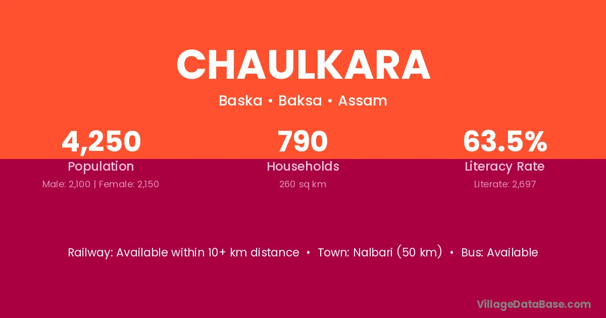 Nalbari (50 km) is the nearest town to Chaulkara village for major economic activities and is located approximately 50 km away.