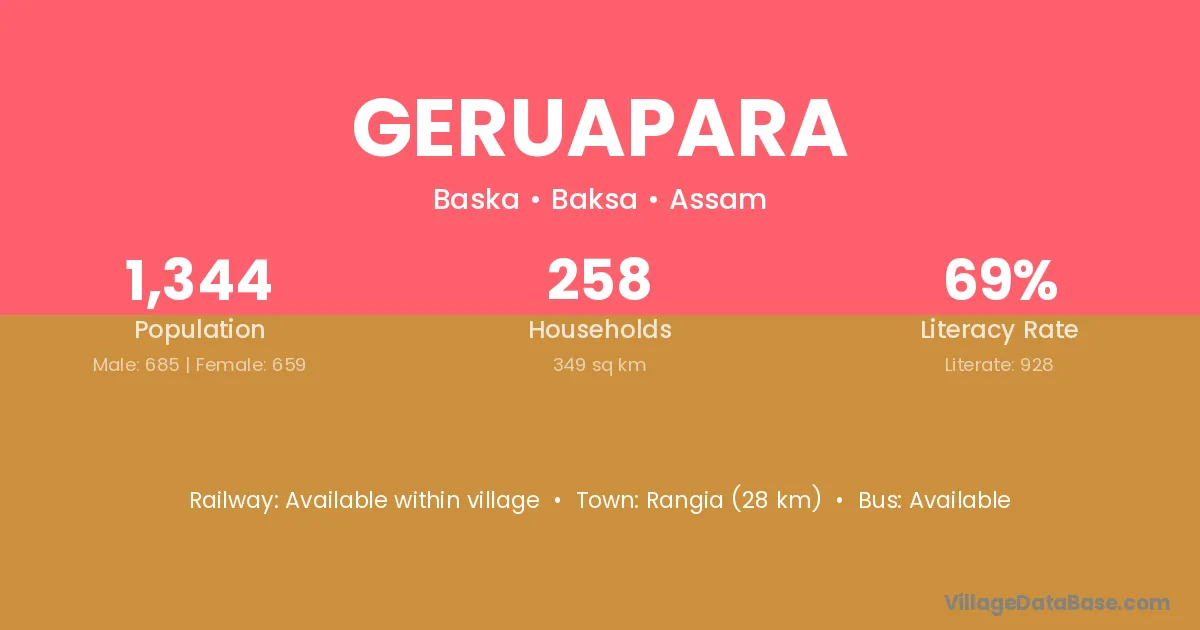 Geruapara village has a total population of 1,344 people, of which 685 are males and 659 are females.