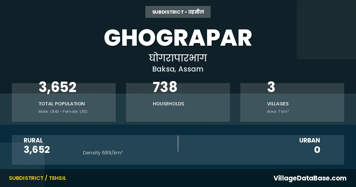 Ghograpar is a town and Subdivision in the Baksa district of the Assam. In India, a Subdivision is a subdivision of a district responsible for the administration and revenue collection of a specific area within the district. Subdivisions play a crucial role in the local governance structure, contributing significantly to the development and administration of their communities.