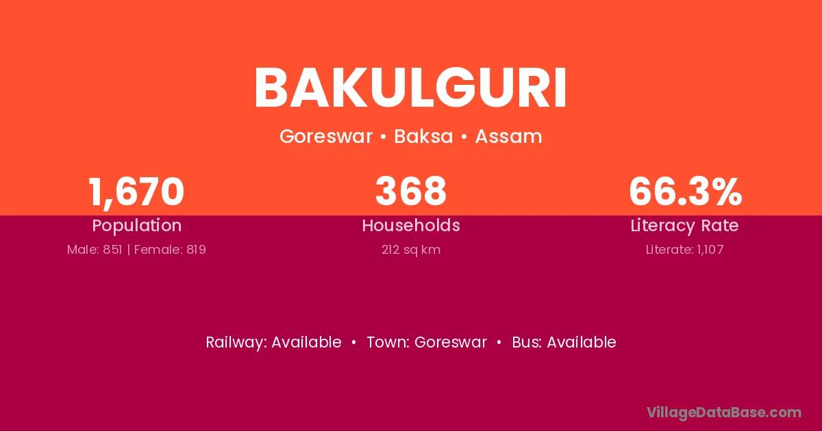 Bakulguri village has a total population of 1,670 people, of which 851 are males and 819 are females.