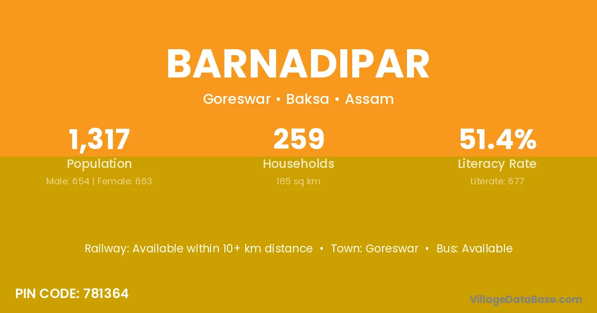 Barnadipar village has a total population of 1,317 people, of which 654 are males and 663 are females.