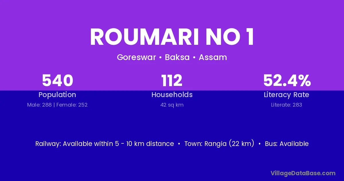 Rangia (22 km) is the nearest town to Roumari No 1 village for major economic activities and is located approximately 22 km away.