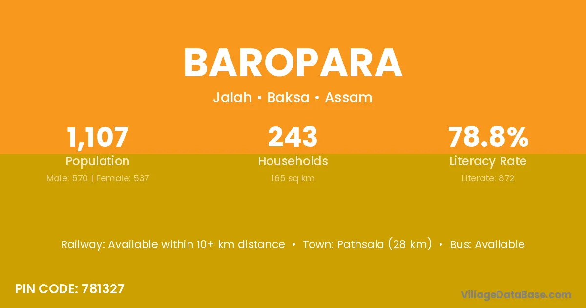 Pathsala (28 km) is the nearest town to Baropara village for major economic activities and is located approximately 28 km away.
