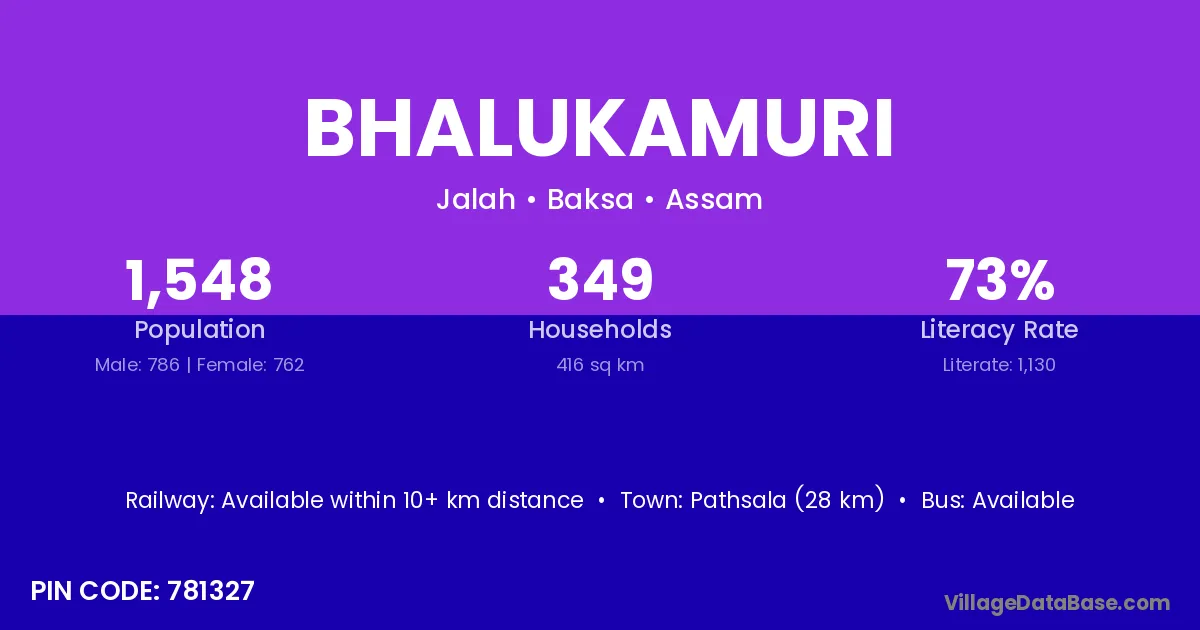 Pathsala (28 km) is the nearest town to Bhalukamuri village for major economic activities and is located approximately 28 km away.