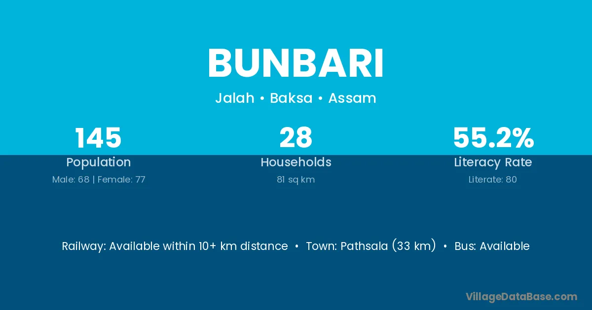 Pathsala (33 km) is the nearest town to Bunbari village for major economic activities and is located approximately 33 km away.