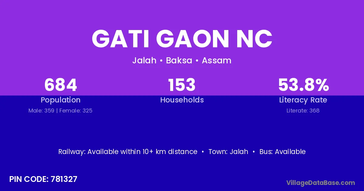 Gati Gaon Nc village has a total population of 684 people, of which 359 are males and 325 are females.