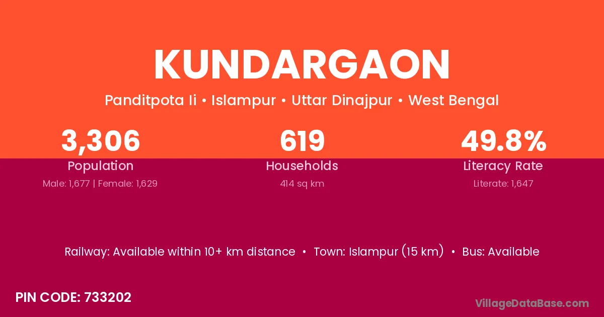 The literacy rate of Kundargaon village is 51.21%. Male literacy stands at 56.07% and female literacy at 45.86%.