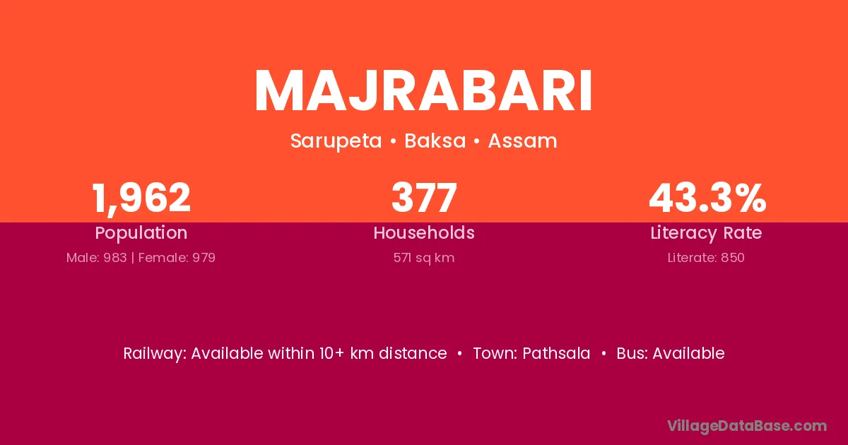 Pathsala (23 km) is the nearest town to Majrabari village for major economic activities and is located approximately 23 km away.