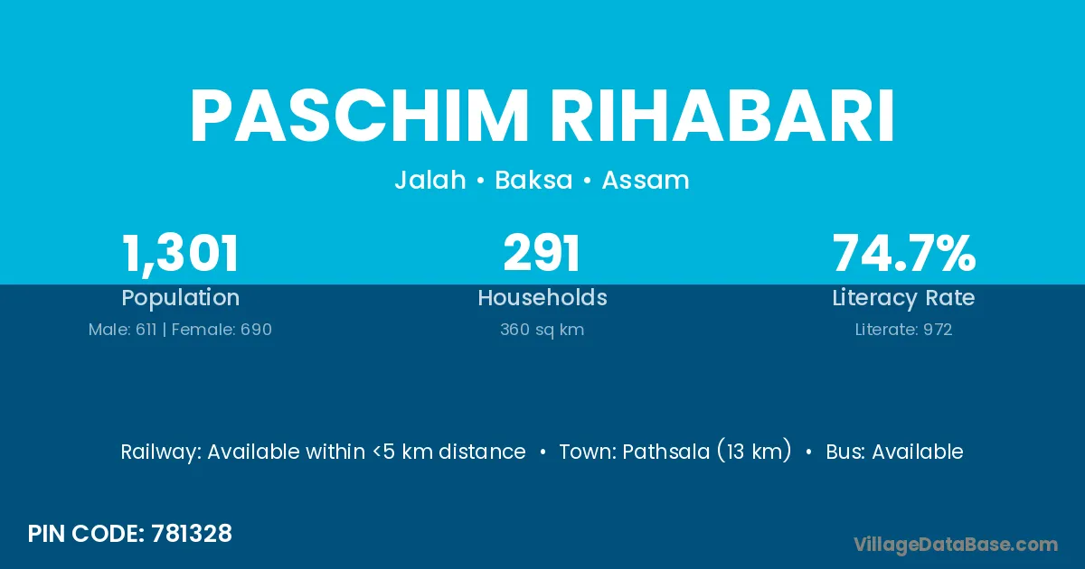 Pathsala (13 km) is the nearest town to Paschim Rihabari village for major economic activities and is located approximately 13 km away.
