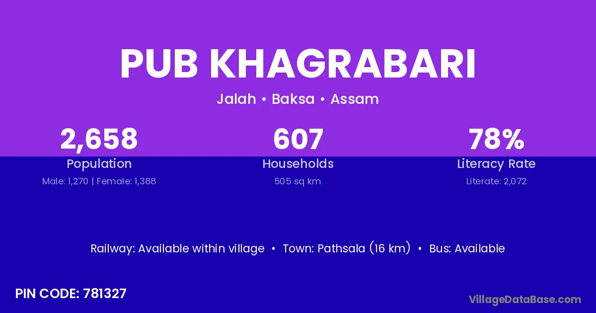 Pathsala (16 km) is the nearest town to Pub Khagrabari village for major economic activities and is located approximately 16 km away.