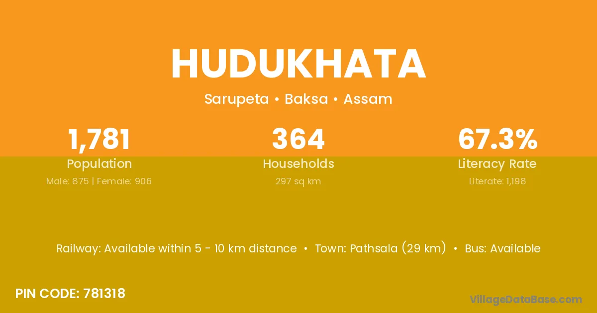Pathsala (29 km) is the nearest town to Hudukhata village for major economic activities and is located approximately 29 km away.