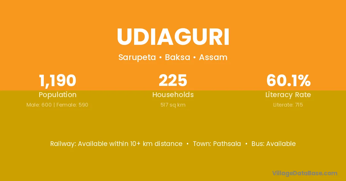 Udiaguri village has a total population of 1,190 people, of which 600 are males and 590 are females.