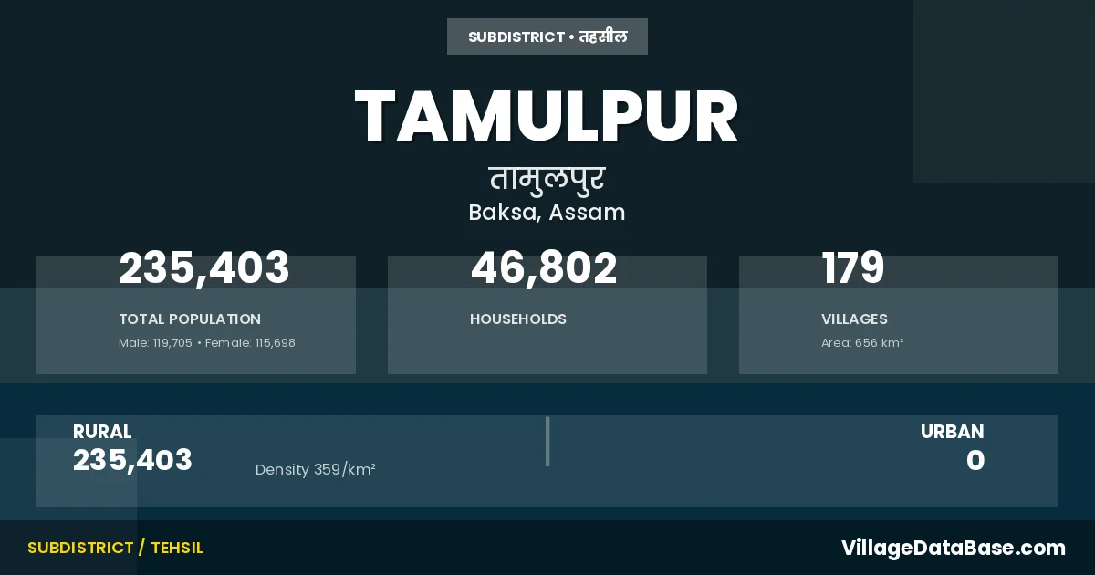 According to the 2011 census The total area of Tamulpur Subdivision is 656 km², with a population of 235403 people. The population density is 359 inhabitants per square kilometre, and there are approximately 46802 houses in the sub district.