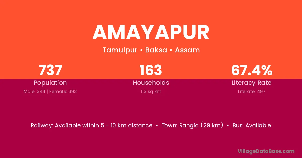 Rangia (29 km) is the nearest town to Amayapur village for major economic activities and is located approximately 29 km away.
