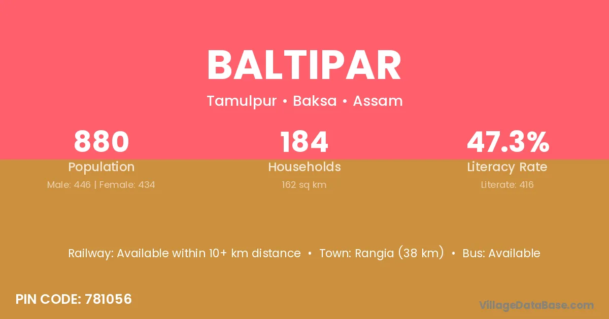 Rangia (38 km) is the nearest town to Baltipar village for major economic activities and is located approximately 38 km away.
