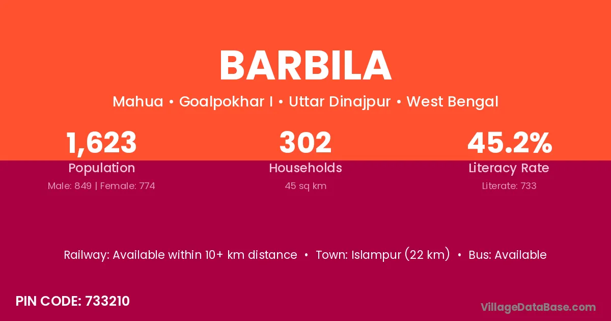 Rangia (30 km) is the nearest town to Barbila village for major economic activities and is located approximately 30 km away.