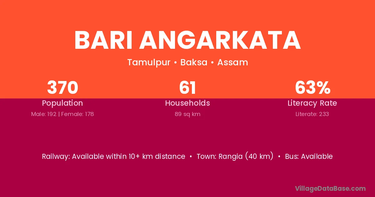 Rangia (40 km) is the nearest town to Bari Angarkata village for major economic activities and is located approximately 40 km away.