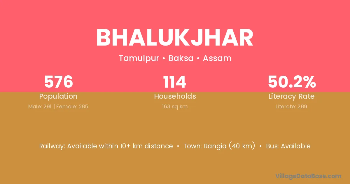 Rangia (40 km) is the nearest town to Bhalukjhar village for major economic activities and is located approximately 40 km away.