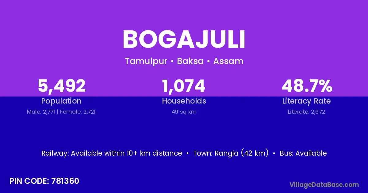 Rangia (42 km) is the nearest town to Bogajuli village for major economic activities and is located approximately 42 km away.