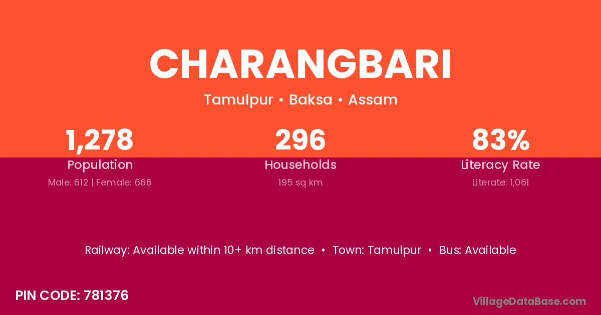 Charangbari village has a total population of 1,278 people, of which 612 are males and 666 are females.