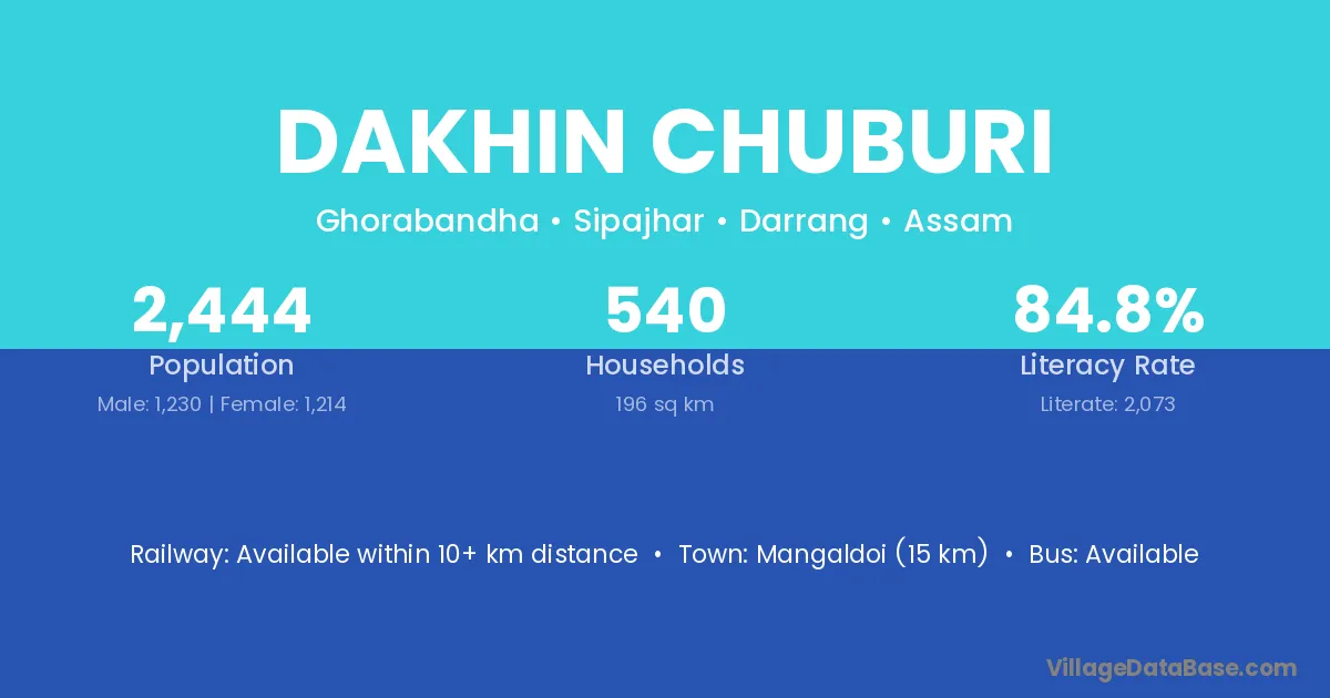 Rangia (30 km) is the nearest town to Dakhin Chuburi village for major economic activities and is located approximately 30 km away.