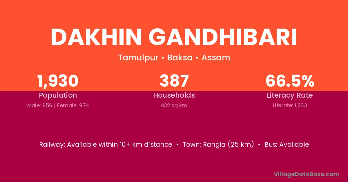 Rangia (25 km) is the nearest town to Dakhin Gandhibari village for major economic activities and is located approximately 25 km away.
