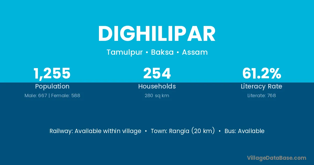 Rangia (20 km) is the nearest town to Dighilipar village for major economic activities and is located approximately 20 km away.