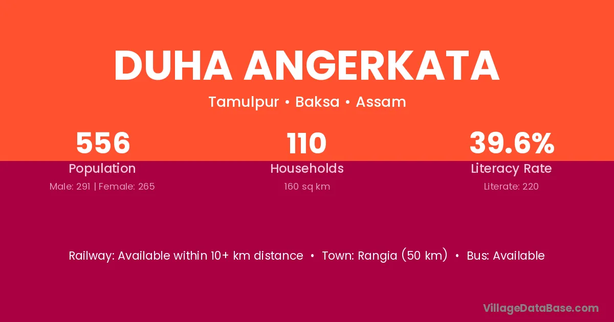 Rangia (50 km) is the nearest town to Duha Angerkata village for major economic activities and is located approximately 50 km away.