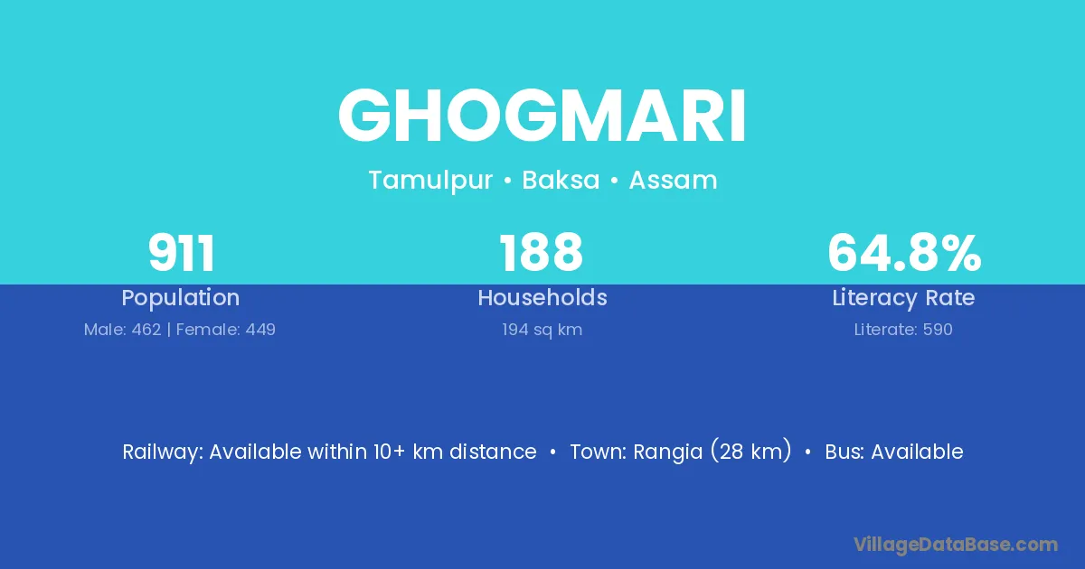 Rangia (28 km) is the nearest town to Ghogmari village for major economic activities and is located approximately 28 km away.
