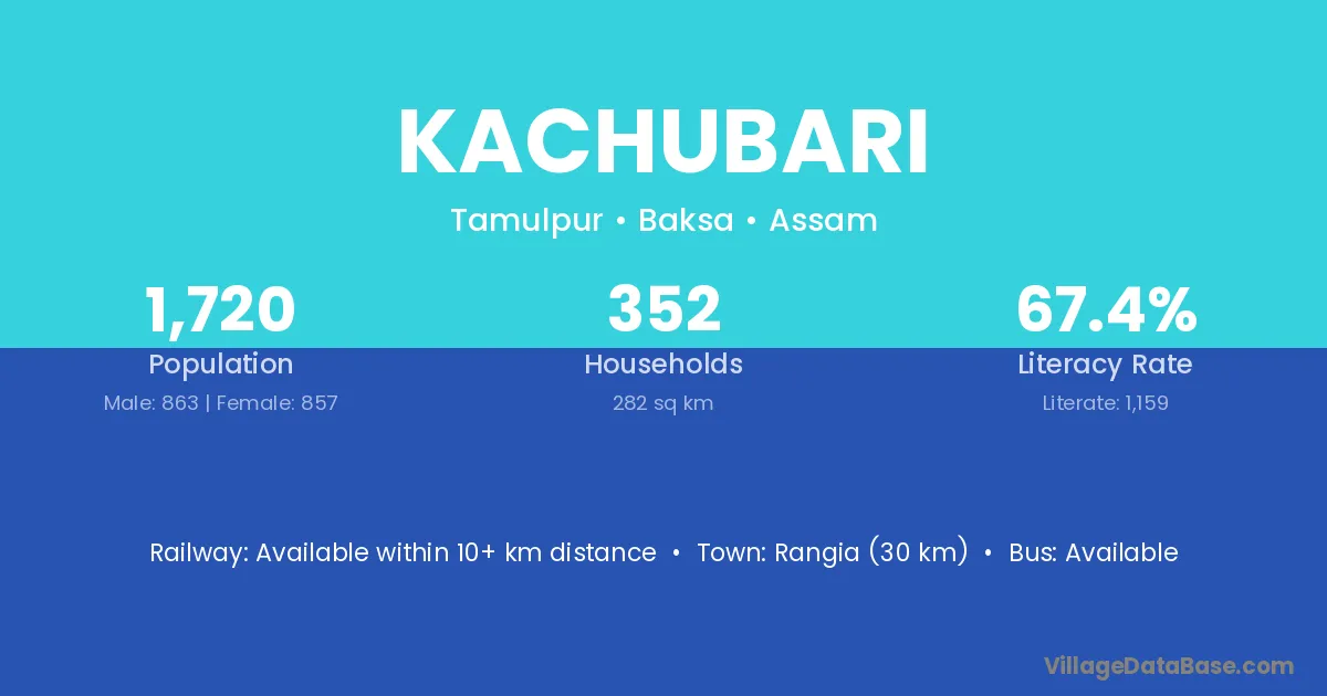 Rangia (30 km) is the nearest town to Kachubari village for major economic activities and is located approximately 30 km away.